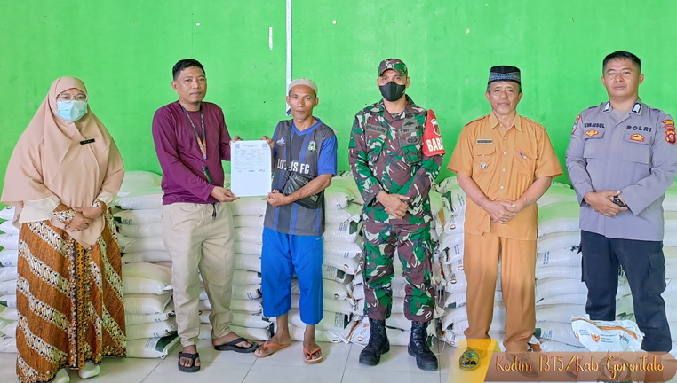 Babinsa Telaga Dampingi Distribusi Bantuan Beras BULOG untuk Warga Desa Pentadio Barat