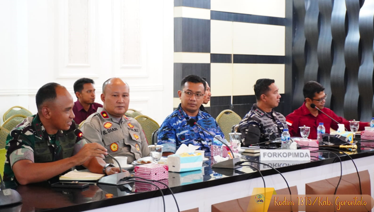 H. Sofyan Puhi, S.T. Bupati Gorontalo dalam sambutannya menyampaikan apresiasi atas kehadiran seluruh unsur Forkopimda. Dalam arahannya, beliau menegaskan pentingnya kesinambungan pemanfaatan lahan eks HGU, percepatan pembangunan dapur MBG, serta dukungan terhadap Koperasi Merah Putih yang telah masuk dalam launching nasional oleh Presiden. Ia juga menekankan pentingnya upacara kemerdekaan sebagai wujud nasionalisme dan meminta agar persoalan sosial seperti waria diarahkan kepada kegiatan yang normatif dan edukatif.