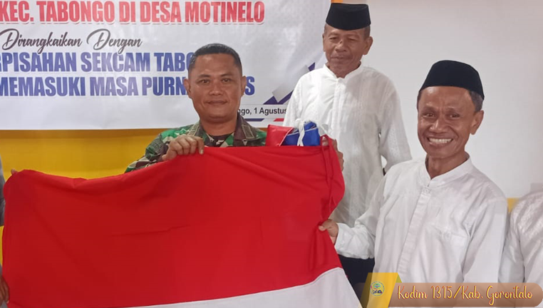 Tabongo, 01 Agustus 2025 – Suasana semangat kebangsaan terasa begitu kuat di wilayah Kecamatan Tabongo pagi itu. Di tengah terik matahari yang mulai menyinari bumi Gorontalo, Danramil 1315-03/Tabongo, Lettu Inf Indra Mooduto, bersama Camat Tabongo Anton Panani, S. Pd, anggota Koramil, serta Kepala Desa Motinelo, tampak kompak melaksanakan kegiatan pembagian 100 lembar bendera Merah Putih beserta umbul-umbul kepada masyarakat Desa Motinelo.