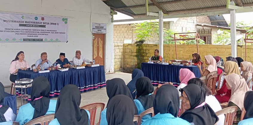 Gorontalo, 26 April 2025 – Mahasiswa Program Studi Diploma Tiga Keperawatan, Kebidanan, Gizi, dan Farmasi Poltekkes Kemenkes Gorontalo melaksanakan kegiatan Musyawarah Masyarakat Desa (MMD I) di Desa Buhu dalam rangka Praktik Kerja Lapangan Terpadu (PKLT) Tahun 2025.