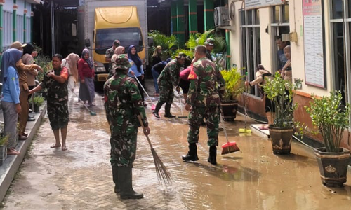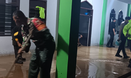 Sinergi TNI dan Warga Bersihkan Sarana Kesehatan dan Tempat Ibadah Pasca Banjir di Limboto Barat